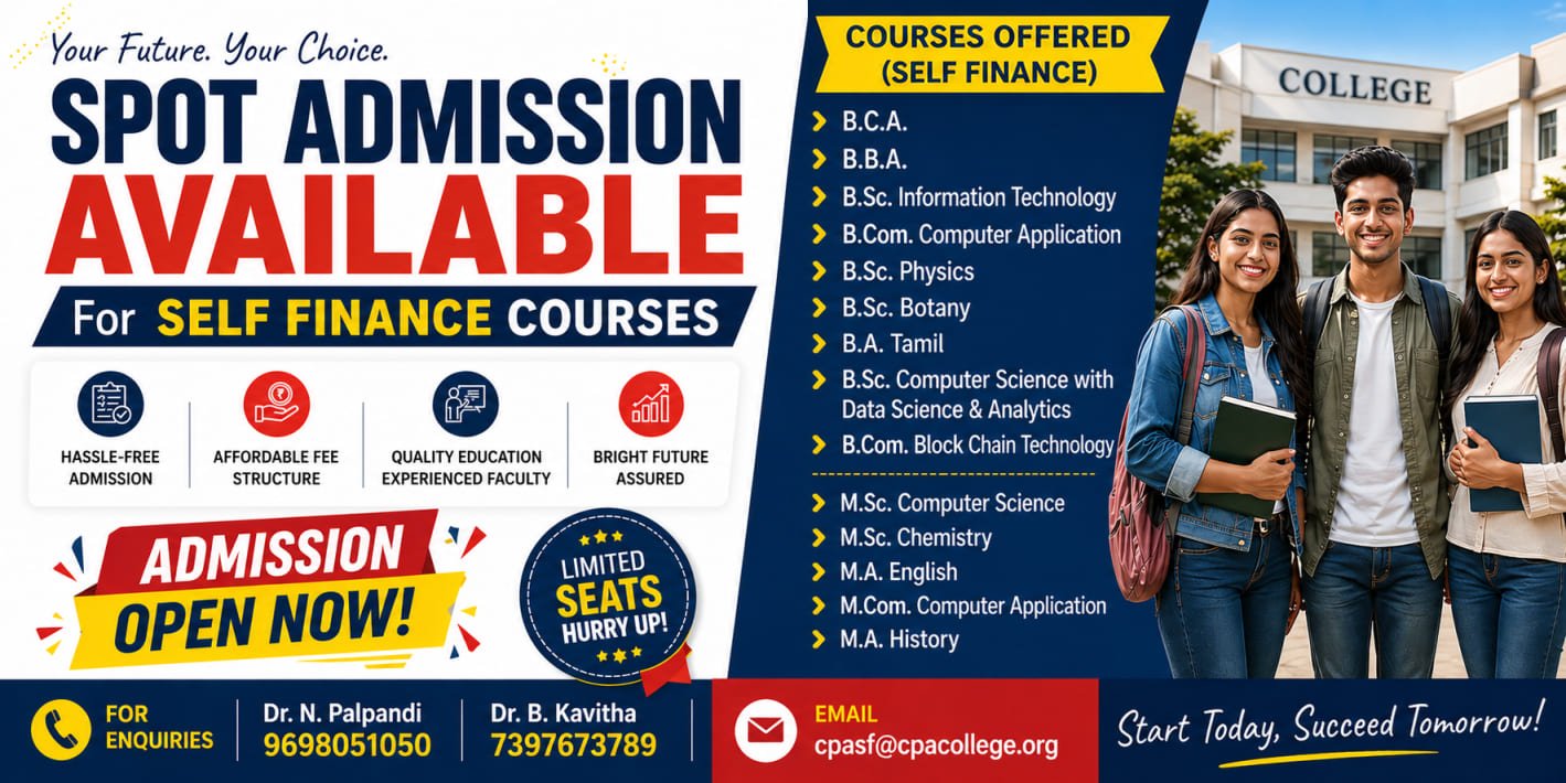 C.P.A. College offers a wide range of undergraduate, postgraduate and research programmes in Arts, Science, Commerce, and Management. With experienced faculty, well-equipped laboratories, library facilities, and a vibrant academic environment, the institution focuses on academic excellence, ethical values, skill development, and holistic growth of students.