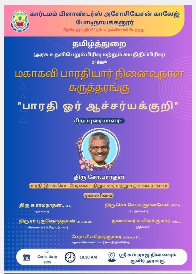 பாரதியார் நினைவுநாள் கருத்தரங்கு ஒவ்வொரு ஆண்டும் தமிழ்த்துறை சுயநிதிப்பிரிவால் கொண்டாடப்பட்டு வருகின்றது. இவ்வாண்டு அரசு உதவிபெறும் பிரிவுடன் இணைந்து 12.09.2025 அன்று சிறப்பாக கொண்டாடப்பட்டது. இந்நிகழ்விற்கான வரவேற்புரை முனைவர் லெ.அலமேலு உதவிப்பேராசிரியர் மற்றும் துறைத்தலைவர் அவர்கள் வழங்கஇ விழாவினை தலைமையேற்று தலைமையுரை வழங்கினார் கல்லூரி முதல்வர் முனைவர் சிவக்குமார் அவர்கள். நிகழ்வின் முன்னிலை உரையினை சுயநிதிப்பிரிவு ஒருங்கிணைப்பாளர் பேராசிரியர் சுரேஷ்குமார் அவர்கள் ஆற்றிட சிறப்புரையாளர் அறிமுக உரையினை தமிழ்த்துறை சுயநிதிப்பிரிவின் தலைவர் மற்றும் உதவிப்பேராசிரியர் முனைவர் நா.பால்பாண்டி அவர்கள் வழங்கினார். கம்பம் பாரதி தமிழ் இலக்கியப் பேரவை நிறுவனர் மற்றும் தலைவர் திரு கவிஞர் சோ.பாரதன் அவர்கள் தமது சிறப்புரையை சீர்மிகு உரையாக மாற்றிட அரசு உதவிபெறும் பிரிவு தமிழ்த்துறை பேராசிரியர் மீனா அவர்கள் நன்றியுரை வழங்கினார். இந்நிகழ்வின் முந்தைய நாள் பாரதியார் இலக்கிய பேச்சுப் போட்டி கட்டுரைப்போட்டி மற்றும் கவிதைப் போட்டி கல்லூரி மாணவர்களுக்கிடையே நடைபெற்றது. இதில் வெற்றிபெற்ற மாணவர்களுக்கு நிகழ்வு அன்று சிறப்பு விருந்தினரால் கெளரவிக்கப்பட்டு கேடயம் பரிசாக வழங்கப்பட்டது.