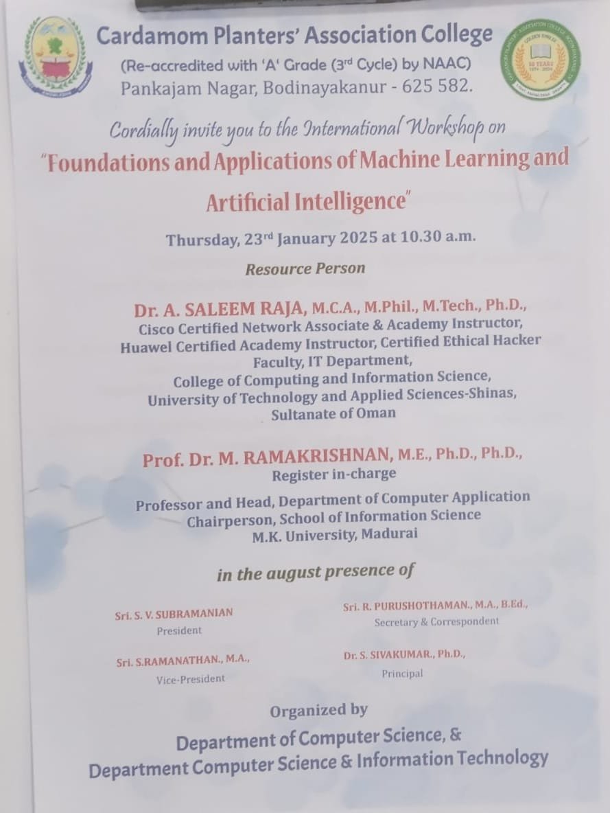 An International workshop on “Foundations and Applications of Machine Learning and Artificial Intelligence” was arranged by our department on 23, January 2025. The function was begun at 10.30 am at the Subburaj Memorial AC Hall. Dr.R.Murugesan, Head & Associate Professor of Computer Science, welcomed the audience. Dr.S.Sivakumar, Principal, gave the presidential address and Dr. K.Nithyanandhakumari, Associate Professor of Computer Science, introduced the chief guest Dr.A.Saleem Raja from Sultanate of Oman. Then, the technical talk on “Foundations and Applications of Machine Learning and Artificial Intelligence” was given by the chief guest. The vote of thanks was delivered by C.Kondalraj, Assistant Professor of CS&IT, followed by National Anthem.