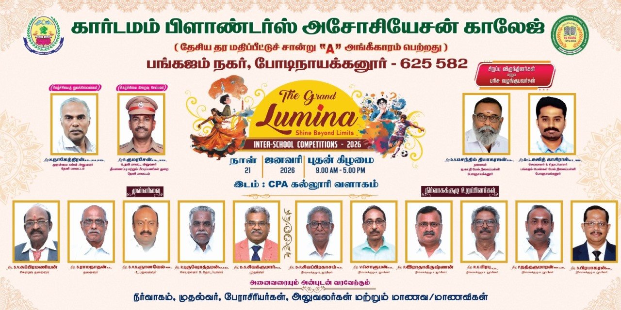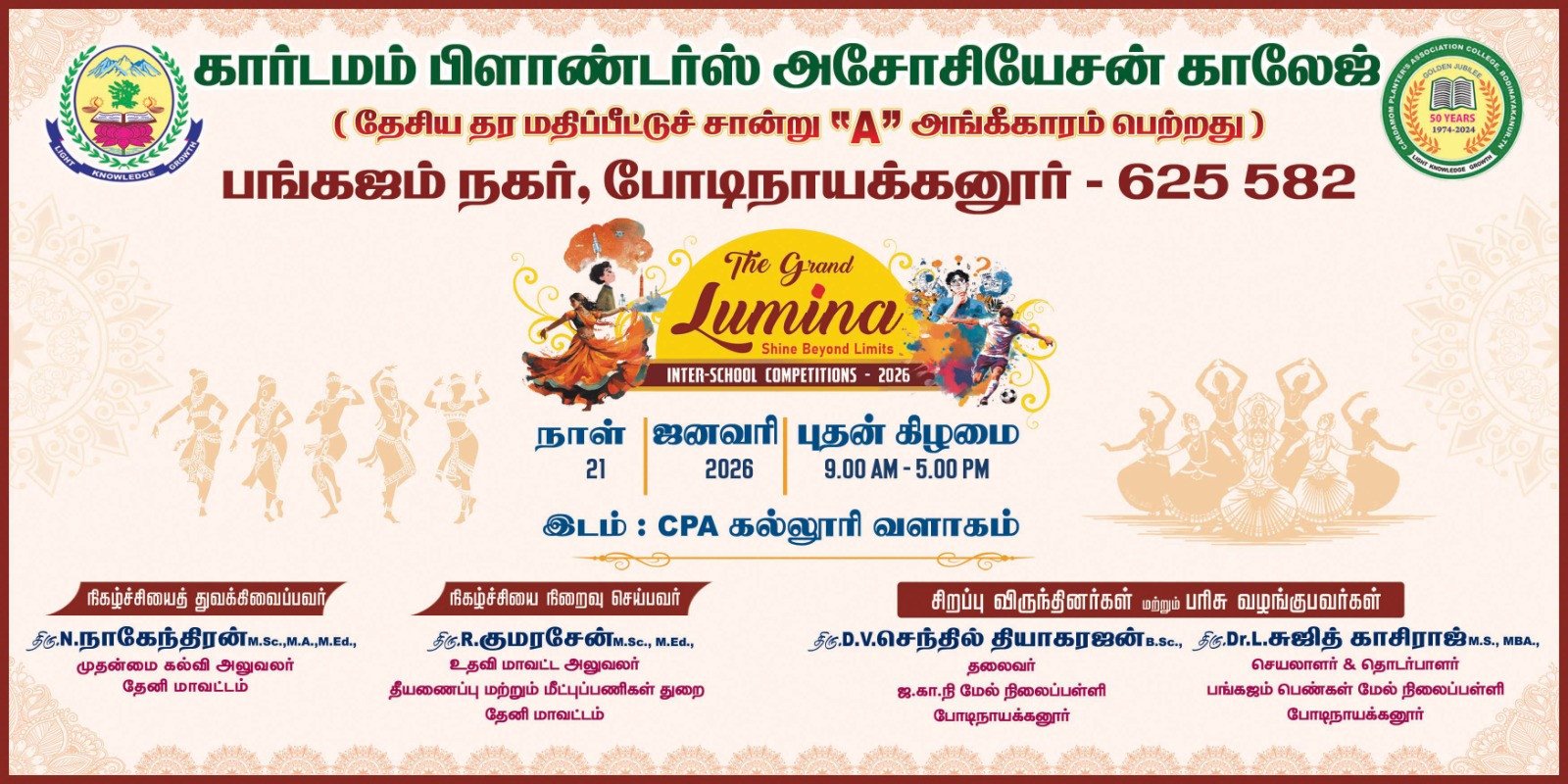 “The Grand Lumina – Inter-School Competitions 2026” என்ற பள்ளிகளுக்கு இடையேயான போட்டிகள் 21.01.2026 அன்று எங்கள் கல்லூரி வளாகத்தில் காலை 9 மணி முதல் மாலை 5 மணி வரை மிகச் சிறப்பாக நடைபெற்றது.