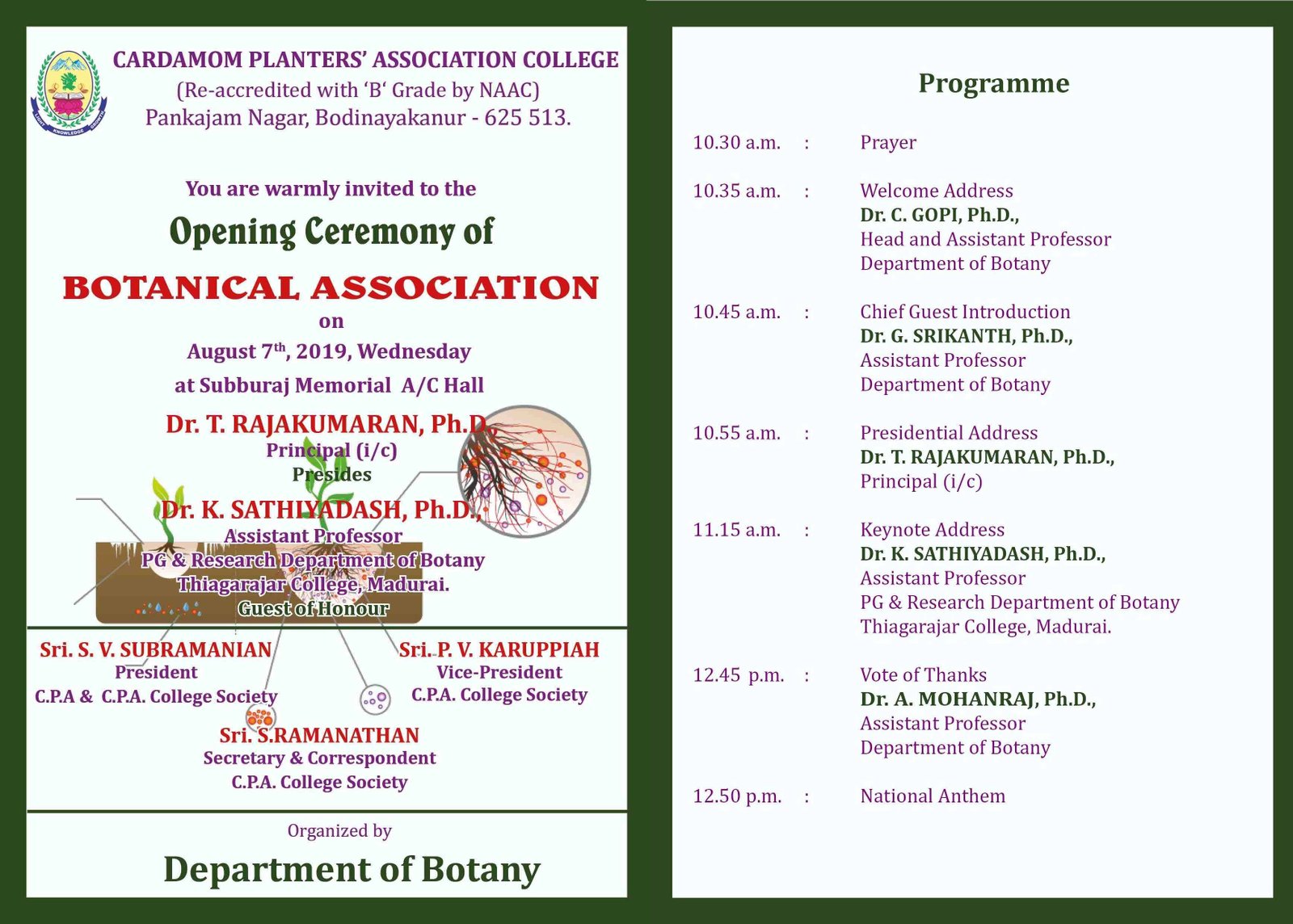 - Botanical Association Opening Ceremony: department of Botany organised Botanical Association opening ceremony on 7th August 2019 at Subbraj AC hall. our college principal Dr Rajakumaran presided over the function Dr Sathyadash Assistant professor of Botany from Thiagarajar College delivered keynote address and Prof vairamani assistant professor botany PMT college felicitated botanical Association inaugural ceremony Dr C. Gopi HOD of Botany CPA college welcome the gathering and Dr mohanraj proposed vote of thanks the student of BSc botany ancillary and major interacted with the chief guest.