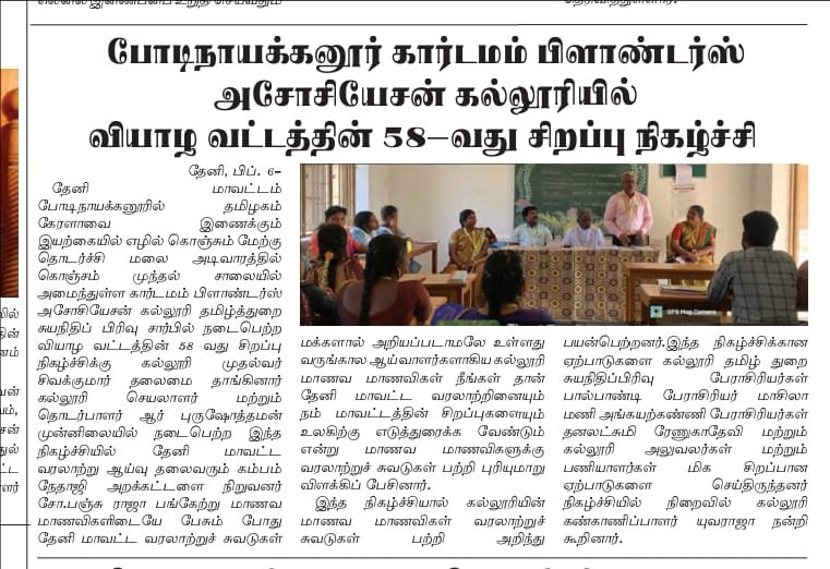 கார்டமம் பிளாண்டர்ஸ் அசோசியேசன் காலேஜ் தமிழ்த்துறை சுயநிதிப்பிரிவில் நடைபெற்ற வியாழ வட்டத்தின் 58 வது சிறப்பு நிகழ்வின் அழைப்பாளராக கவிஞர் சோ. பஞ்சுராஜா, நிறுவனர் நேதாஜி அறக்கட்டளை, தேனி மாவட்ட வரலாற்று ஆய்வுமைய தலைவர் அவர்கள் கலந்துகொண்டார். அவர் தம் சிறப்புரையில் தேனி மாவட்ட வரலாற்றுச் சுவடுகள் மக்களால் அறியப்படாமலே இருக்கின்றது. வருங்கால ஆய்வாளர்களாகிய நீங்கள் தான் தேனி மாவட்ட வரலாற்றினையும், சிறப்புக்களையும் உலகிற்கு எடுத்துரைக்க வேண்டும் எனக்கூறினார். வியாழ வட்ட நிகழ்வில் தமிழ்த்துறை மாணவிகள் மூன்றாமாண்டு தேன்மொழி, இரண்டாமாண்டு அபிநயா மற்றும் முதலாமாண்டு காவியா ஆகியோர் வைரமுத்து கவிதைகள், பாரதியார் பாடல்கள், சிறுகதை விமர்சனம் ஆகியனவற்றை மிகச் சிறப்பாக வெளிப்படுத்தினர். நிகழ்வினை முதலாமாண்டு மாணவிகள் ருத்ரா மற்றும் யுவஶ்ரீ ஆகியோர் மிகச்சிறப்பாகத் தொகுத்து வழங்கினர். பேராசிரியர் முனைவர் பா.அங்கயற்கண்ணி தொகுப்பாளர்களுக்கு சிறப்பானதொரு பயிற்சிதந்து நிகழ்வு சிறப்புடன் அமைந்திட வழிவகை செய்தார்.