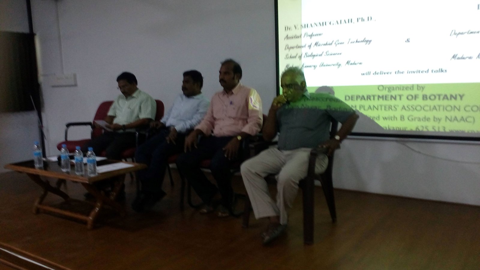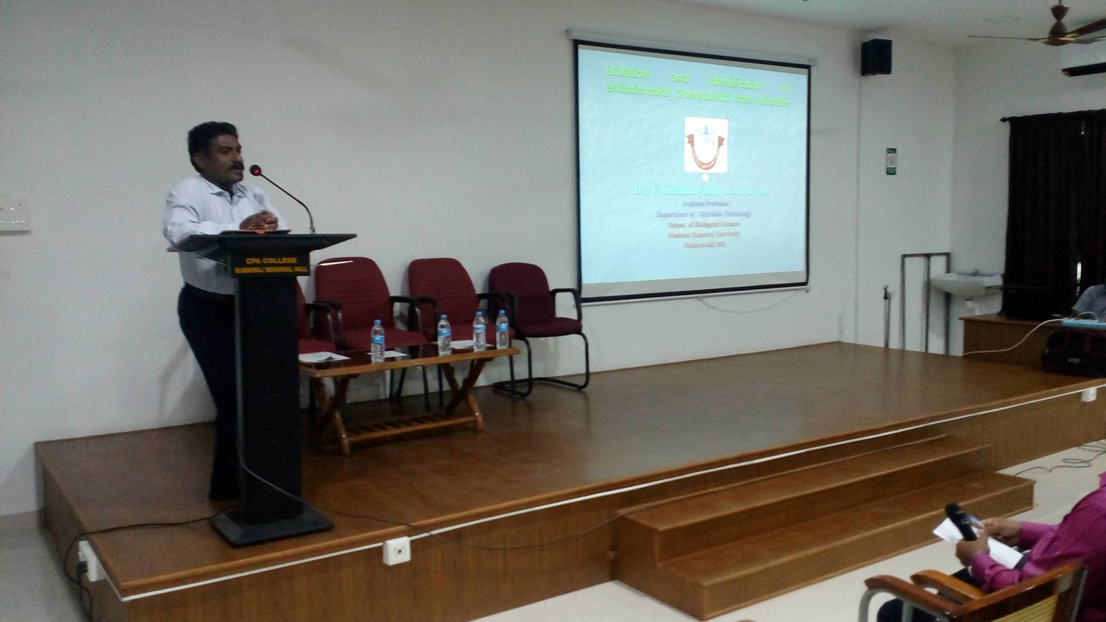 Dr. S. ESWARAMOORTHI, Ph.D., Principal i/c Presides, Dr. V. SHANMUGAIAH, Ph.D., Assistant Professor, Department of Microbial Gene Technology, School of Biological Sciences, Madurai Kamaraj University, Madurai, & Dr. M. PANDI, Ph.D., Assistant Professor, Department of Molecular Microbiology, School of Biotechnology, Madurai Kamaraj University, Madurai will delivered the invited talks, Organized by