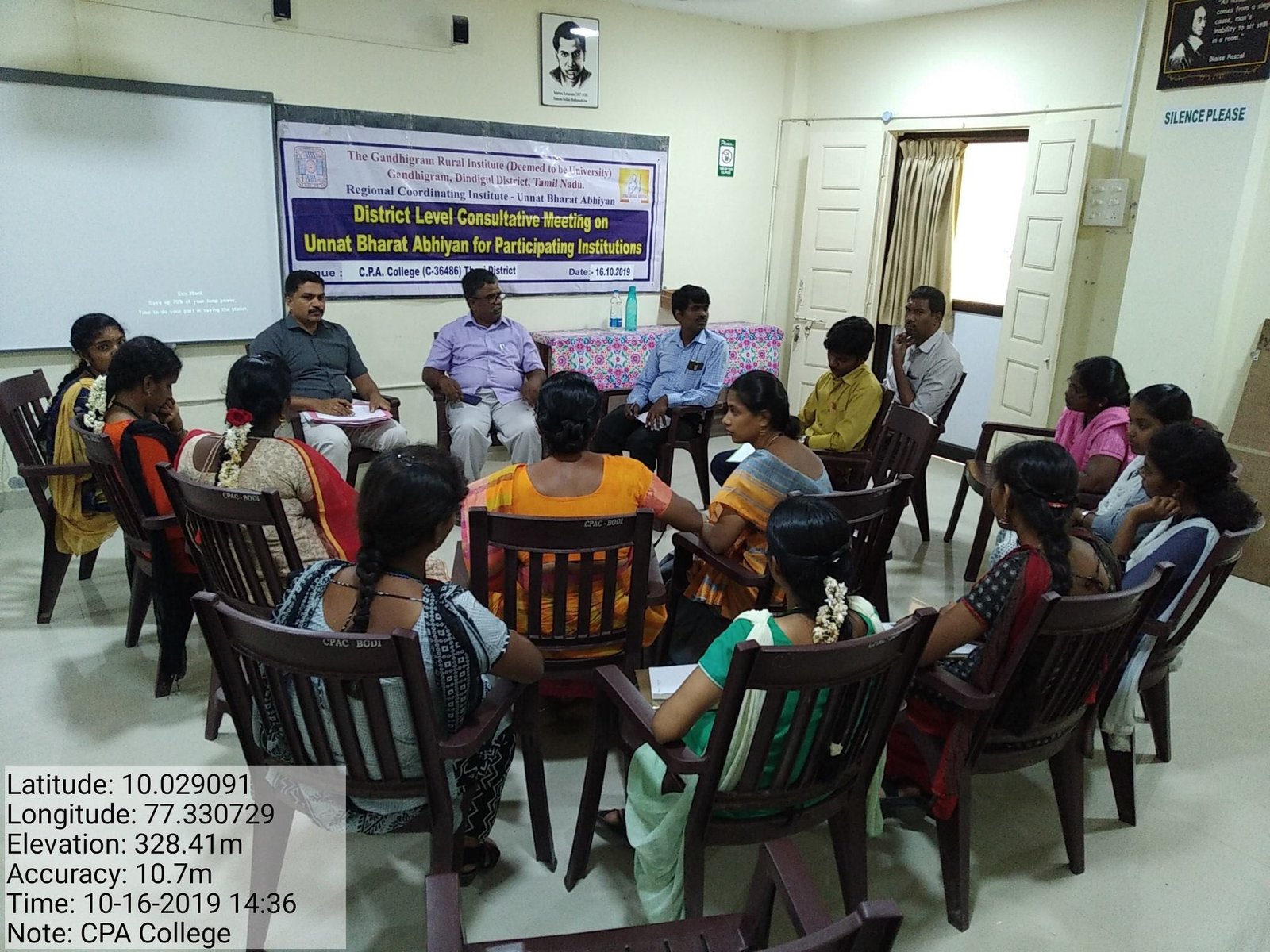 A District Level Consultative Meeting among the Participating Institutions in Theni, Districts was conducted at CPA College, Bodinayakanur, Theni District to facilitate you all to carry out the UBA activities successfully on 16.10.2019.