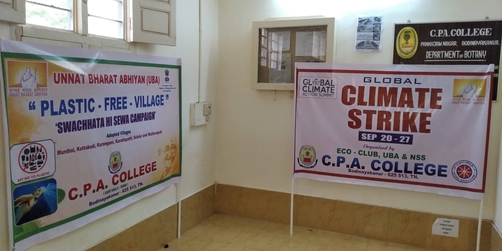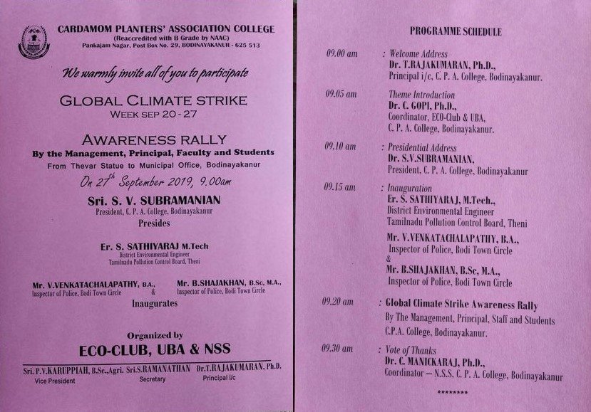 - Global Climate Strike Sep-2019: Climate Change Awareness rally was conducted behalf of Unnat Bharat Abhiyan, Eco-Club and NSS of Cardamom Planter's Association College on 27th September 2019 between 9.00-9.40am from Thevar Statue to Municipal Office of Bodinayakanur Town. In this campaign our college Management, Principal, Professors, Non-Teaching Staff, Students and Publics of around 2000 members were participated in rallies with raising awareness slogans. At this awareness rally, the students carried out various awareness campaigns on the environment with banners of avoid plastic, save water, public transport & bicycle usage, etc. The college vice-president inaugurated the awareness rally. Bodi-Municipal Police Inspectors, District Pollution Control Board Director, Principal and Coordinator were in the forefront. As a result of this, everyone came to the college today by public transport and bicycle. Automobiles were completely avoided, especially two-wheelers, four-wheelers. This makes our college two-wheeler and four-wheeler-free campus.