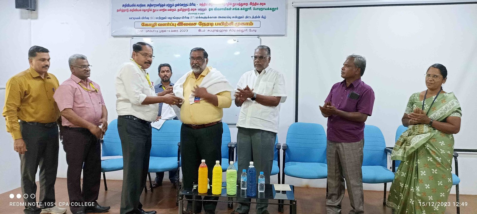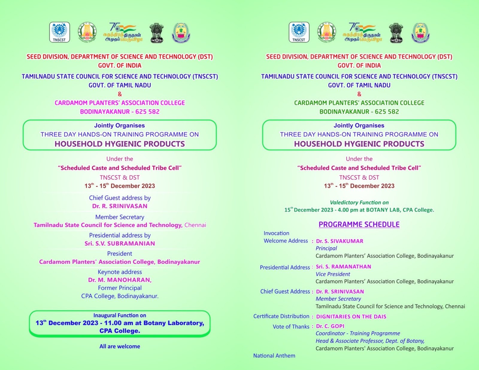 Dr.C.Gopi, Coordinator-TNSCST-SCST 2024 organized Three days “Live Training in Poultry Farming” (Two training camps) and Three days “Live Training in Sanitary Products Production” (Three training camps) for SC ST of Theni Districts, under Seed Division, Department Of Science And Technology (Dst), Govt. of India, Tamilnadu State Council for Science and Technology (TNSCST), Govt. of Tamil Nadu & Cardamom Planters’ Association College, Bodinayakanur – 625582 during 06.12.2023-12.12.2024.