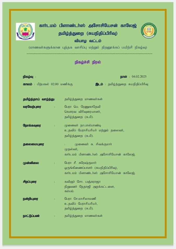 - Venue : Department of Tamil (SF), C.P.A College,