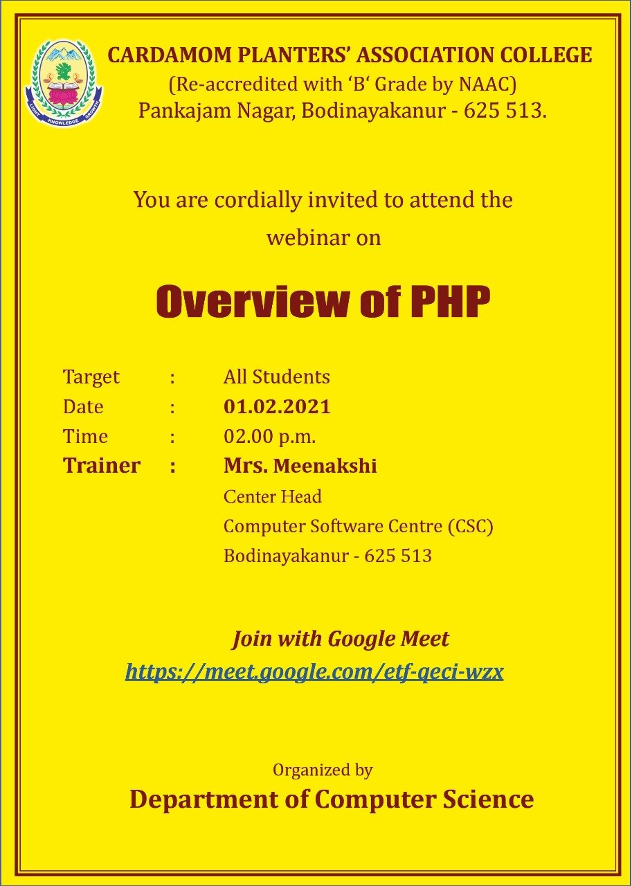 Dr. K. Madasamy, Associate Professor & Head i/c welcomed the audience. Principal i/c Dr. S. Sivakumar, presided over the function and delivered the presidential address. Mrs. Meenakshi Suresh, Centre Head – CSC, Bodinayakanur has delivered a talk on "Overview of PHP" through online. The uses of PHP was explained well by her.