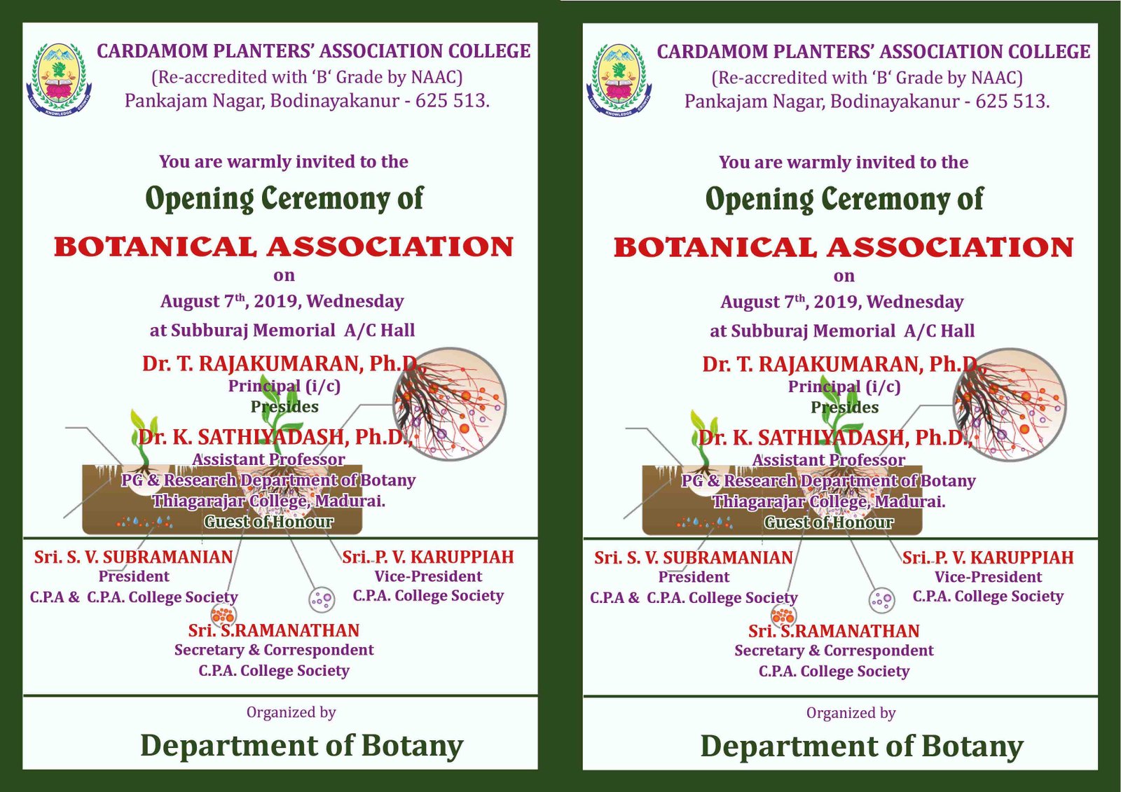 Botanical Association Opening Ceremony: department of Botany organised Botanical Association opening ceremony on 7th August 2019 at Subbraj AC hall. our college principal Dr Rajakumaran presided over the function Dr Sathyadash Assistant professor of Botany from Thiagarajar College delivered keynote address and Prof vairamani assistant professor botany PMT college felicitated botanical Association inaugural ceremony Dr C. Gopi HOD of Botany CPA college welcome the gathering and Dr mohanraj proposed vote of thanks the student of BSc botany ancillary and major interacted with the chief guest.