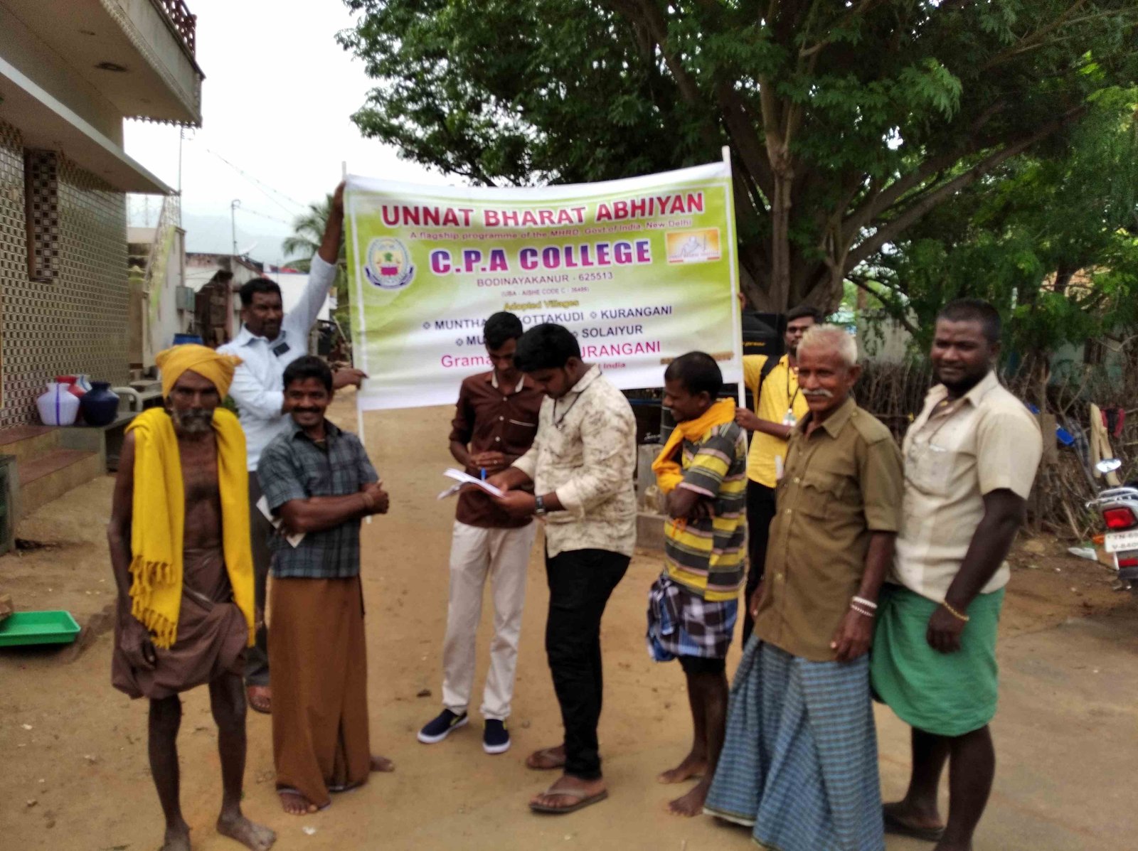 Bodinayakanur, C.P.A College adopted Solaiyur, the most backward village under the Unnat Bharat Abhiyan (UBA) Scheme. On 12.07.2019, under the guidance of the Management and Principal Dr. T.Rajakumaran, the Coordinator Dr. C.Gopi and his team Dr. A. Mohanraj, Dr. Srikanth, Mr. Rajarathinam, and fifty B.Sc., Botany students went to Solaiyur village and provided Tree saplings, vegetable seeds to villagers and schoolchildren at free of cost. Awareness programs on rural hygiene were also provided.