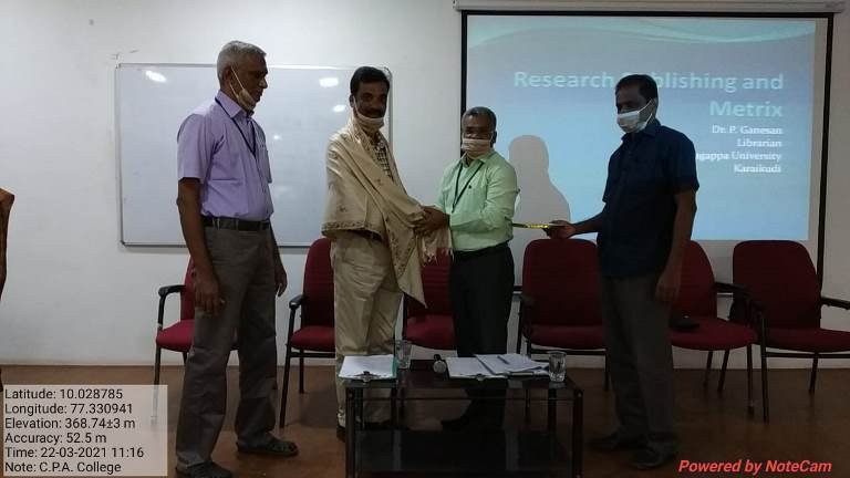 Dr.R.Murugesan, IQAC's Co-ordinator, delivered the welcoming addres. Dr.S.Sivakumar, Principal, made a presidential address. Following that, Dr.G.Mangai, Librarian, will introduce the chief guest. Dr.P.Ganesan, Librarian, Central Library, Alagappa University, Karaikudi deliver a keynote address on “Research Publication and Its Metrics”.
