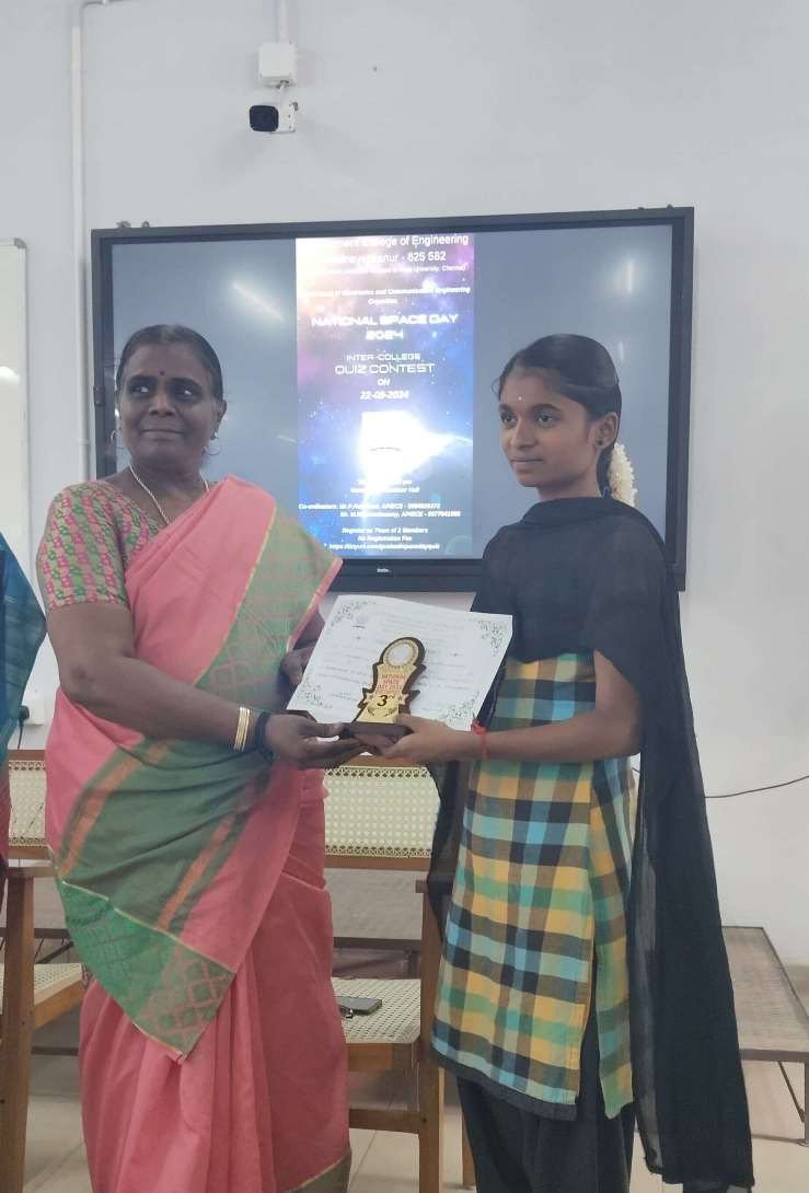 Two students from C.P.A. College, Bodinayakanur, have brought pride to the institution by securing the third prize in the Inter-College Quiz Competition organized by the Department of Electronics and Communication Engineering (ECE). The event took place on 22nd August 2024 at the Government College of Engineering, Bodinayakanur, Theni.